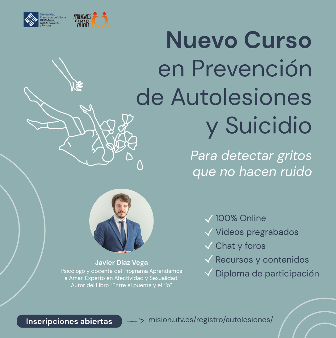 Javier Díaz Vega, psicólogo y conferenciante, profesor del Programa Aprendamos a Amar de la UFV y autor del libro Entre el puente y el río: Una mirada de misericordia ante el suicidio, será el director y docente del curso. Junto a él han trabajado Nieves González Rico, directora académica del Instituto Desarrollo y Persona y Elena Arderius, directora clínica del Centro de Acompañamiento Integral de las Familias de la UFV, como parte del comité científico del curso.
