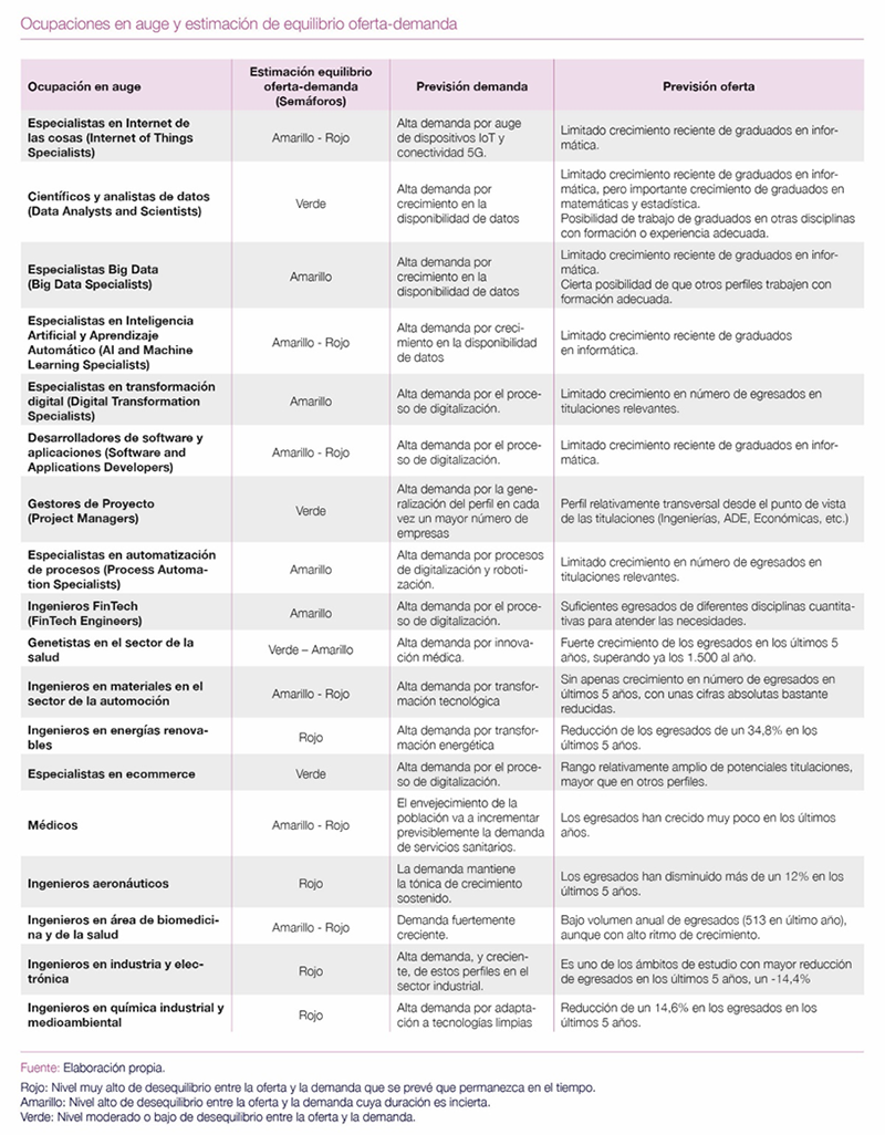 En este sentido, el estudio señala una serie de empleos que, de cara al futuro, pueden sufrir un mayor desequilibrio entre las necesidades de las empresas y la disponibilidad de perfiles. Existen ciertas posiciones categorizadas en el semáforo del informe con el color rojo, es decir, cuya demanda se incrementará drásticamente y para los que habrá pocos profesionales disponibles, lo que supone grandes oportunidades para los profesionales que se quieran forman en estas competencias. Entre estos puestos se encuentran los especialistas en Internet de las cosas, Inteligencia Artificial y Aprendizaje Automático; desarrolladores de software y aplicaciones o ingenieros en energías renovables, aeronáutica o química industrial y medioambiental. En común tienen, de nuevo, la digitalización y la transición medioambiental, claves para la empleabilidad de las próximas décadas.
