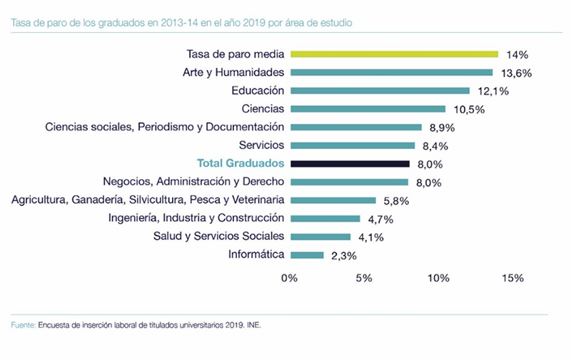 Los estudios elegidos son determinantes también en lo que se refiere a tasa de paro. De este modo, los estudios de Informática solo cuentan con una tasa del 2,3%, a distancia de Salud y servicios sociales (4,1%) y de Ingeniería, industria y construcción (4,7%). Por su parte, Artes y humanidades cuenta con una tasa del 13,4%, seguida por Educación (12,1%) y Ciencias (10,5%). No obstante, incluso la tasa de desempleo más elevada es inferior a la tasa media de paro (14,1%), lo que confirma que la mayoría de los estudios universitarios tienen un efecto positivo sobre la empleabilidad.