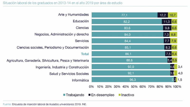 El 96,3% de los graduados en Informática tiene un empleo cinco años después de su graduación, seguidos por las áreas de Salud y servicios sociales (92,1%) e Ingeniería, industria y construcción (92,1%). Por el contrario, el 77,1% de los egresados de Artes y humanidades trabajan tras este periodo, por debajo de los que disponen de estudios superiores de Educación (82,2%) y Ciencias (83,6%).