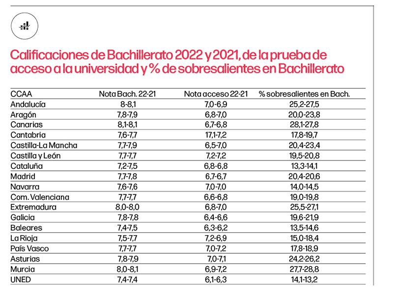 De acuerdo con las últimas estadísticas disponibles del Ministerio de Universidades, diez comunidades autónomas han registrado una pequeñísima caída en las notas de bachiller con respecto a 2021 y el resto se ha mantenido exactamente igual.