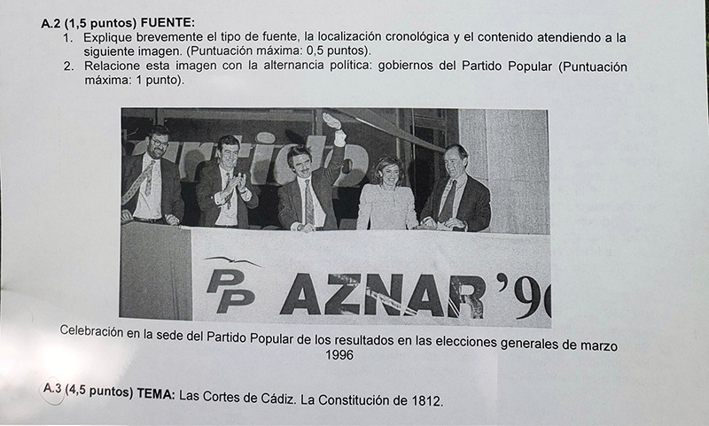 Pilar Alegría, portavoz del PSOE y ministra de Educación, ha acusado al PP de «politizar» estas pruebas por haber escogido esa fotografía de Aznar para la prueba de acceso a la universidad. Le ha contestado la consejera madrileña de Cultura, Turismo y Deporte en funciones, Marta Rivera de la Cruz, que ha negado cualquier intento de politización de ese examen.