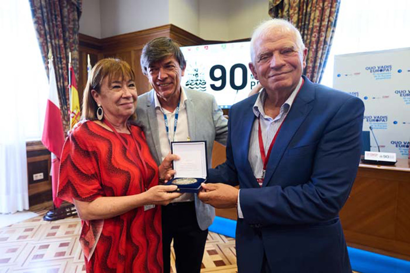 El rector de la UIMP, Carlos Andradas, con Cristina Narbona y Josep Borrell, que recibió una medalla conmemorativa de la UIMP en la última edición del curso. © JUAN MANUEL SERRANO ARCE