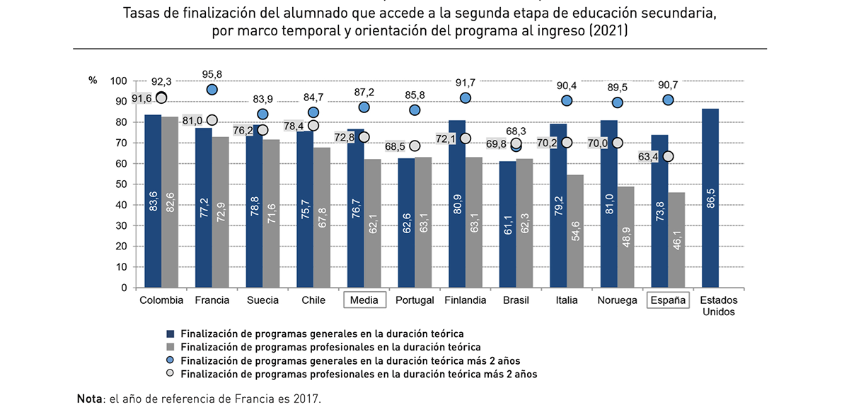 En España, el 73,8% de las personas que acceden a un programa general (Bachillerato) lo concluyen en la duración teórica. Este porcentaje se incrementa hasta el 90,7% dos años después. En los programas de Formación Profesional las tasas son inferiores, del 46,1% y 63,4%, respectivamente. Para la media de países con datos disponibles, en los programas generales los porcentajes son del 76,7% y 87,2%, respectivamente, y para los programas profesionales, del 62,1% y 72,8%, respectivamente.