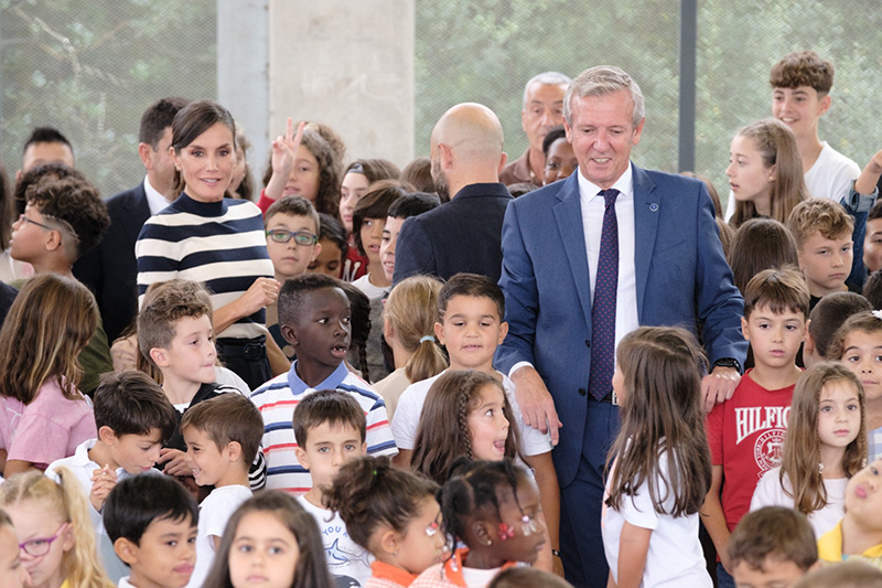 Tras complicaciones por la niebla, que obligaron al avión en el que viajaba a aterrizar en A Coruña en lugar de en Santiago, según ha informado Casa Real, Letizia empezó su recorrido en el gimnasio de este centro de educación infantil y primaria plurilingüe para proceder al descubrimiento de una placa. A continuación, acompañada por el presidente de la Xunta, Alfonso Rueda; el titular del Parlamento de Galicia, Miguel Santalices; el delegado del Gobierno en la Comunidad, Pedro Blanco; el conselleiro de Educación, Román Rodríguez; el alcalde, Álex Doval, y el director del centro, Francisco Ávila, la reina dio comienzo a las distintas paradas.