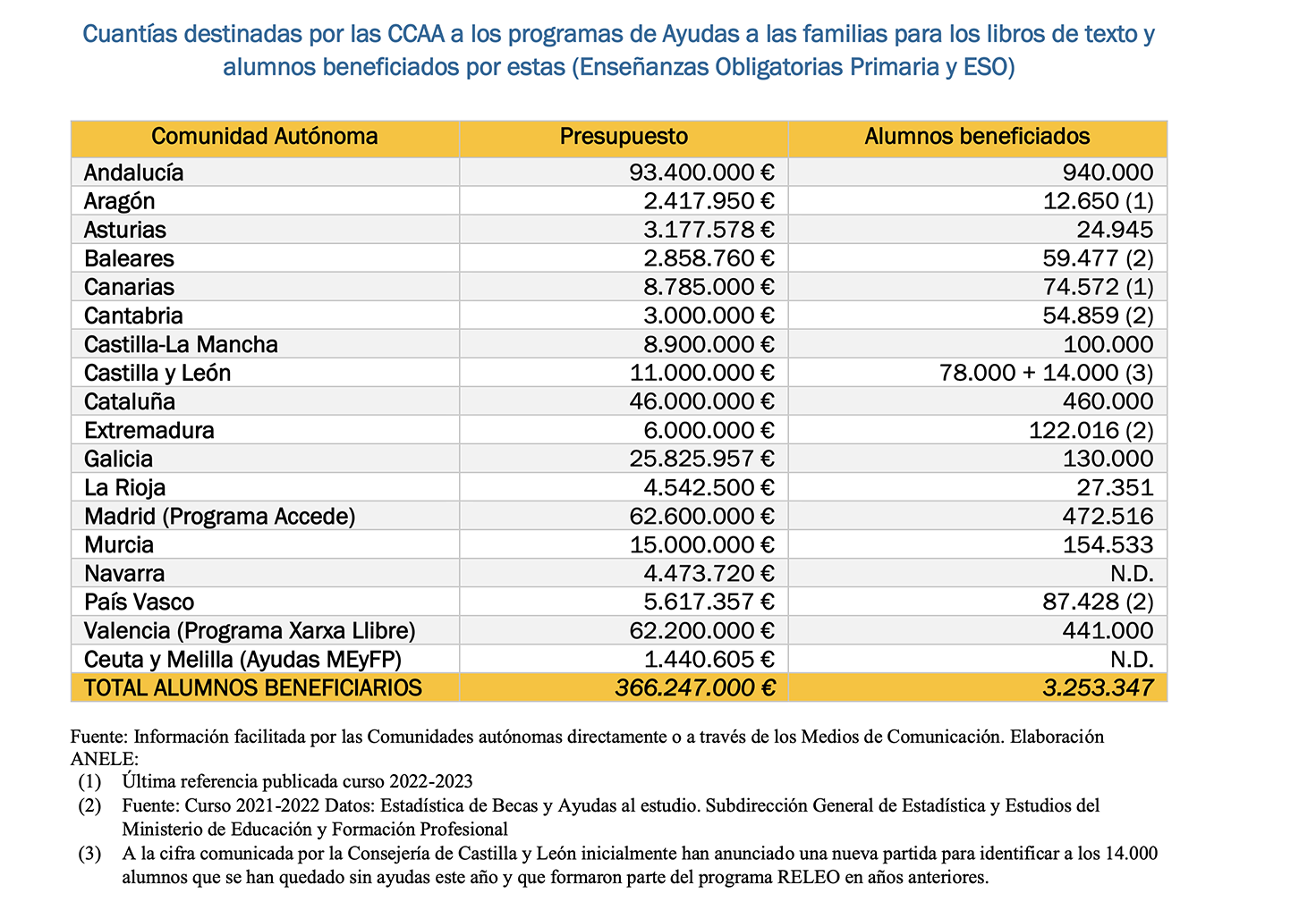 No obstante, el Informe constata que las comunidades destinarán este curso 2023-24 una cuantía global superior a los 366 millones de euros a sus programas de ayudas a las familias, según la información facilitada por las propias comunidades. Una cuantía que permitiría que cerca del 70% del alumnado de las etapas obligatorias (Primaria y ESO), dispondrían de algún tipo de ayuda, total o parcial para los libros de texto.