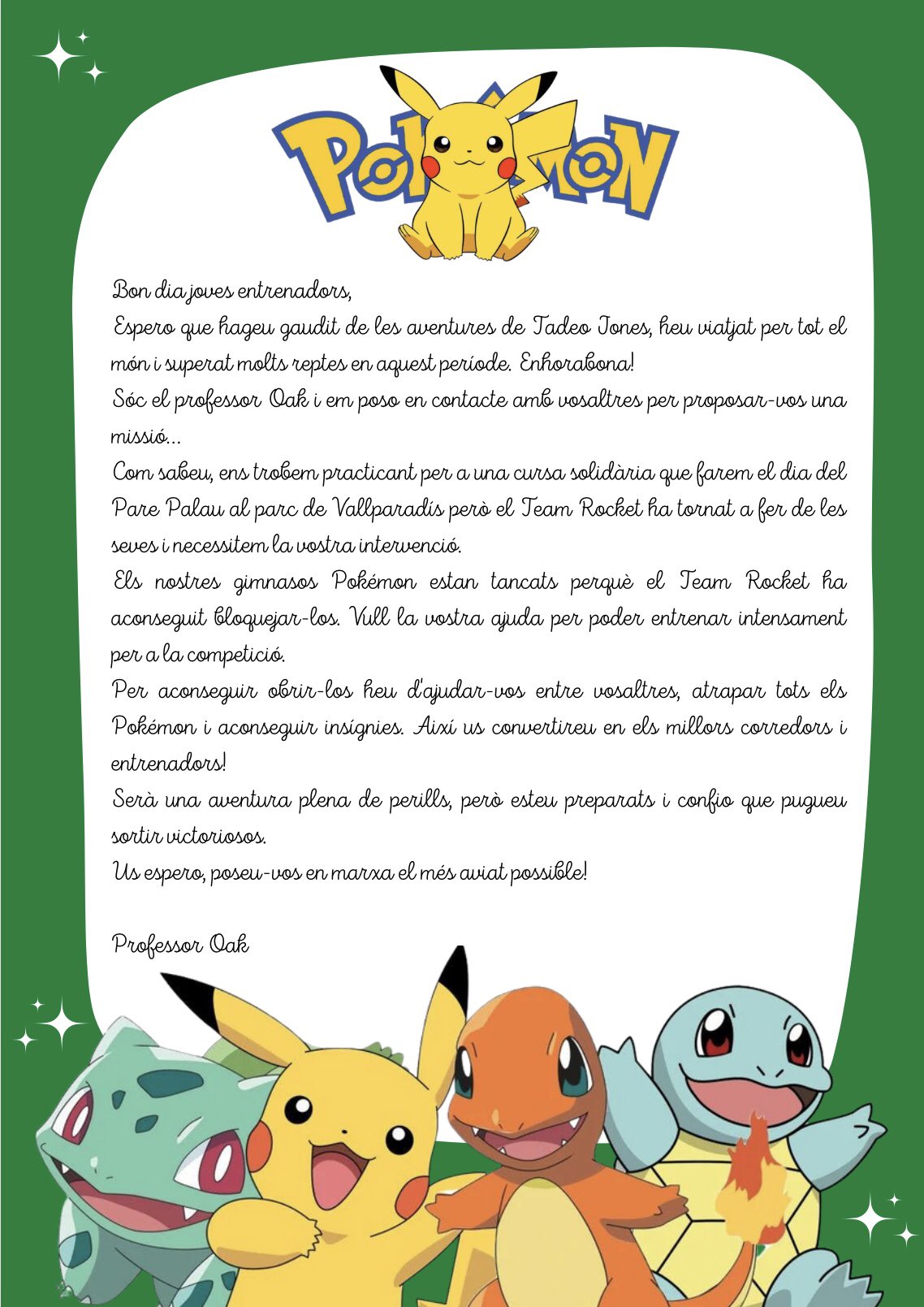 A diferencia de las aventuras Pokémon en la pantalla, este proyecto fue exclusivamente presencial, sumergiendo a los estudiantes en una experiencia tangible y activa. El punto de partida fue una carta ingeniosamente escrita por el Profesor Oak, un personaje entrañable de la serie. En su carta, el Profesor Oak invitaba a los estudiantes a participar en una carrera solidaria que se llevaría a cabo en el pintoresco parque de Vallparadís. El objetivo: recaudar fondos para Sakassou, una localidad en Costa de Marfil. Con esta perspectiva solidaria, el proyecto adquirió un significado más profundo, convirtiéndose en una oportunidad para aprender y contribuir al bienestar global.