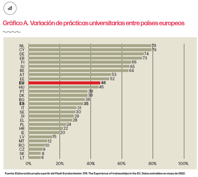 Para empezar, notemos que las prácticas varían mucho entre países europeos (gráfico A), pero que en casi todos ellos hay una proporción significativa de estudiantes que las hacen.