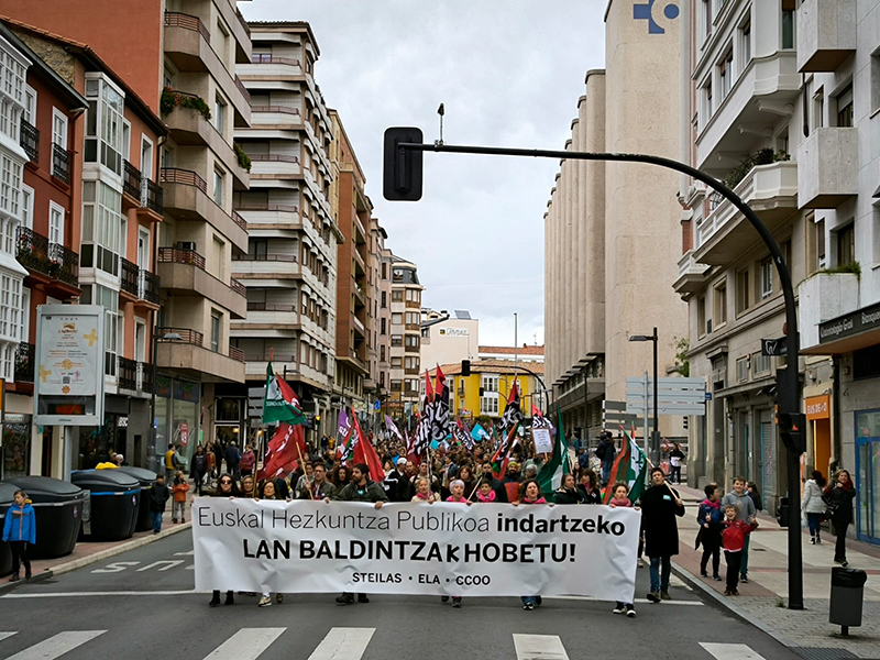 Miles de trabajadores se han sumado a las manifestaciones que han tenido lugar en las tres capitales vascas con motivo de esta jornada de paro, llevada a cabo bajo el lema «Euskal Hezkuntza Publikoa indartzeko, lan-baldintzak hobetu» («Mejorar las condiciones de trabajo para reforzar la Educación Pública Vasca»).