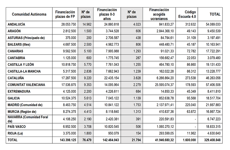 De acuerdo con la información facilitada por el Ministerio de Educación, Andalucía recibirá 52,93 millones de euros, Cataluña 39,71 y la Comunidad Valenciana 31,62, mientras que Madrid tendrá 19,3 millones, casi igual que Castilla y León (18,57 millones), País Vasco (17,77), Galicia (17,56) y Canarias (17,55 millones de euros). Esas tres comunidades podrán crear con estos fondos más del 44 % del total de plazas: Andalucía 18.985, Cataluña 12.848 y la Comunidad Valenciana 11.632, en tanto que en Castilla y León serán 7.025, en Galicia 6.752, en Canarias 6.393 y en Madrid 6.267.