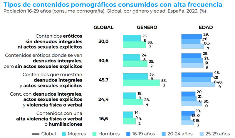 En relación con la tipología de vídeos consumidos, predominan como preferencia los productos que muestran desnudos integrales y actos sexuales explícitos sin violencia explícita. Un 45,6% de los jóvenes y adolescentes reconocen que visualizan esta clase de vídeos con mucha o cierta frecuencia. Le siguen los contenidos con desnudos integrales, pero sin actos sexuales explícitos (30,7%) y los contenidos eróticos sin desnudos ni sexo explícito.Respecto a los contenidos a los que además se les suma violencia física o verbal, son vistos con asiduidad por el 24,7% de las y los jóvenes consumidores de porno y un 16,6% reconoce que consume porno con alta violencia y humillaciones con mucha o cierta frecuencia. En este último caso, el de los contenidos altamente violentos y denigrantes, es el único donde hay más jóvenes que dicen no consumirlo que lo contrario.