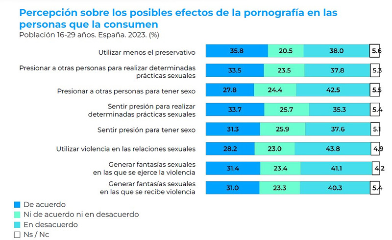 La desinformación en relación con este ámbito se ve suplida con el consumo pornográfico. Un 56,1% afirma que el porno les ayuda a conocer y comprender mejor el sexo, un 49,5% lo consideran una fuente de inspiración y alrededor de un 20% entienden que el porno es un recurso útil para su educación sexual.