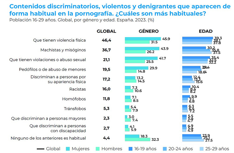 La investigación también refleja que un 28,2% de los encuestados considera que hay una correlación directa entre el porno y la reproducción de la violencia. Afirman que es habitual encontrarse con: violencia física (38,4%), machismo y misoginia (34,8%) o violaciones o abuso sexual (33,3%). Por otra parte, uno de cuatro encuestados creen que los contenidos discriminatorios, violentos y denigrantes no son habituales.