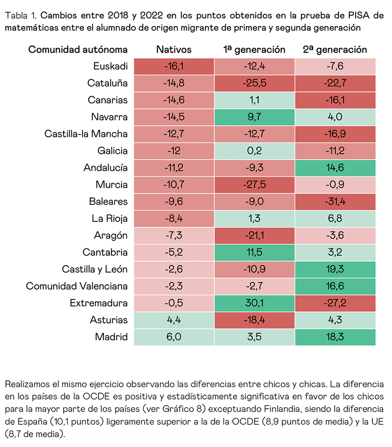 En la mayoría de comunidades la caída en resultados sobre 2018 ha sido superior en el alumnado de origen nacional, aunque Cataluña presenta unas caídas especialmente pronunciadas para el de origen migrante. La segregación escolar por origen nacional ha aumentado significativamente respecto a 2018, tanto a nivel nacional como autonómico, y es más alta en Cataluña, Euskadi y Madrid.