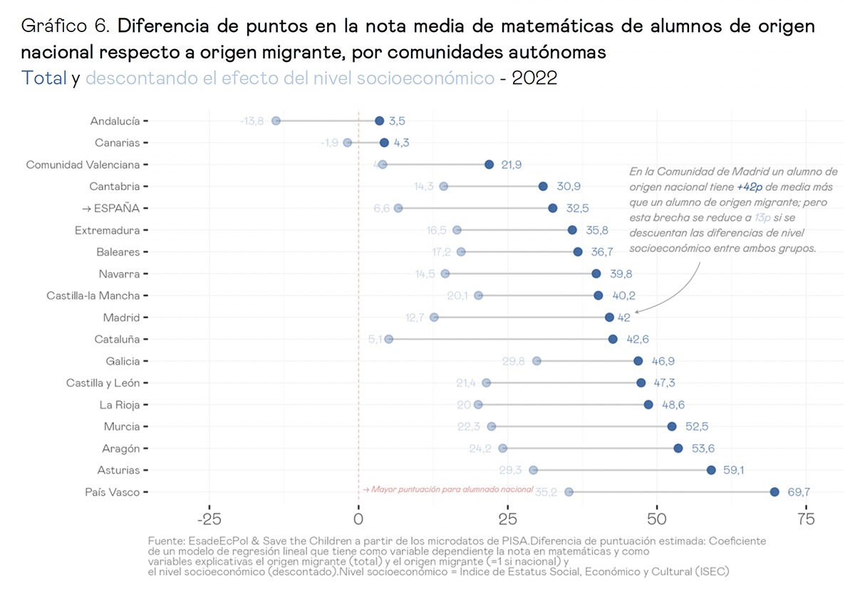 En cuanto a la segregación escolar por nivel socioeconómico está por debajo de la media de la OCDE: Desde 2018 se ha reducido en casi todas las autonomías, pero es especialmente alta en Madrid –pese a su mejora– y Cataluña. Las desigualdades por origen migrante muestran que un alumno de primera o segunda generación saca de media 32,5 puntos menos en la prueba de matemáticas que uno de origen nacional, pero esta brecha se reduce a 6,6 puntos una vez descontado el efecto de la desigualdad socioeconómica entre ambos grupos. En este último indicador, las brechas son mucho más altas en el País Vasco (35 puntos), Galicia o Aragón.