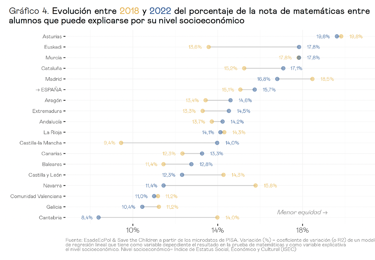 Son resultados de un estudio de Save The Children y el Centro de Políticas Económicas de Esade para diagnosticar el estado de la equidad o igualdad de oportunidades en la educación en España y sus autonomías a partir de un análisis pormenorizado de los datos del último informe PISA 2022, comparándolos con el anterior de 2018. PISA 2022, publicado por la OCDE este día 5, reflejó un empeoramiento global de las competencias del alumnado de 81 países en ciencias, matemáticas y lectura, unos malos resultados que se reprodujeron en España pero con menores caídas en las puntuaciones debido, en parte, a que su escuela resistió mejor el impacto de la COVID-19.
