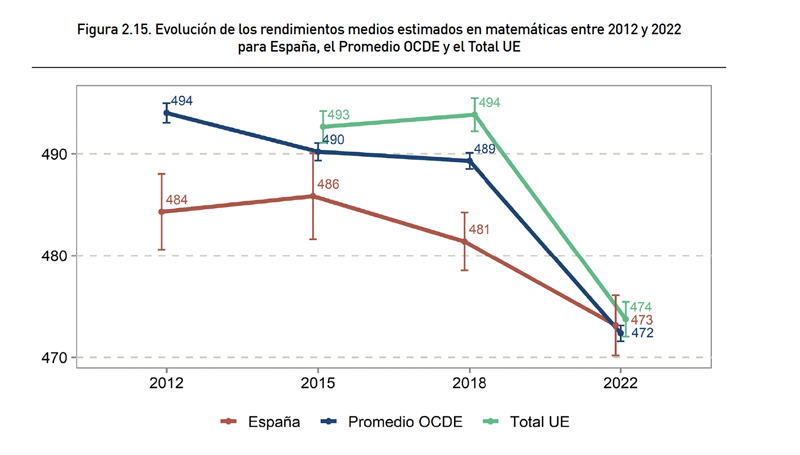 El rendimiento medio en España en 2022, en las tres, fue significativamente inferior al de 2012 y 2015, la última evaluación en la que los resultados son comparables plenamente con los de 2022 a escala nacional.