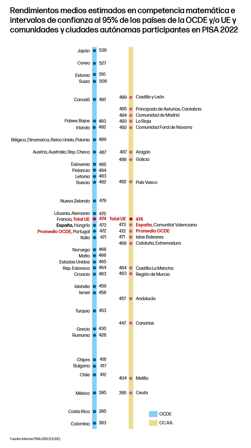 Esta bajada de nivel de competencias supone que uno de cada cuatro alumnos de 15 años de la OCDE tenga un bajo rendimiento en Matemáticas, Lectura y Ciencias. O, lo que es lo mismo, que tenga problemas para usar algoritmos básicos o interpretar textos simples. Y el descenso puede atribuirse al Covid, pero solo en parte, porque venía de antes. Además, hubo países que, en este contexto, mantuvieron su nivel en Matemáticas o incluso lo mejoraron, como Australia, Japón, Corea, Singapur o Suiza, que se sitúan en el ranking entre los 487 y 575 puntos.