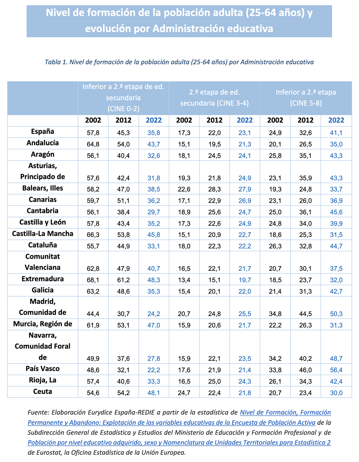 En 2022, el 35,8% de la población española en la franja de edad entre 25 y 64 años tiene un nivel de estudios inferior a 4º de ESO, Bachillerato y FP Básica y de Grado Medio, mientras que el 41,1% de los españoles con edades entre 25 y 64 años ha acabado la Educación Superior. En este último nivel de estudios, las comunidades con los porcentajes más altos son País Vasco (56,4%); Madrid (50,3%); Navarra (48,7%); Cantabria (45,6%); Cataluña (44,7%); Galicia (42,7%); Aragón (43,3%); Asturias (43,3%) y La Rioja (42,4%).
