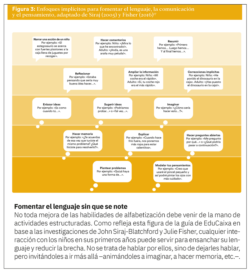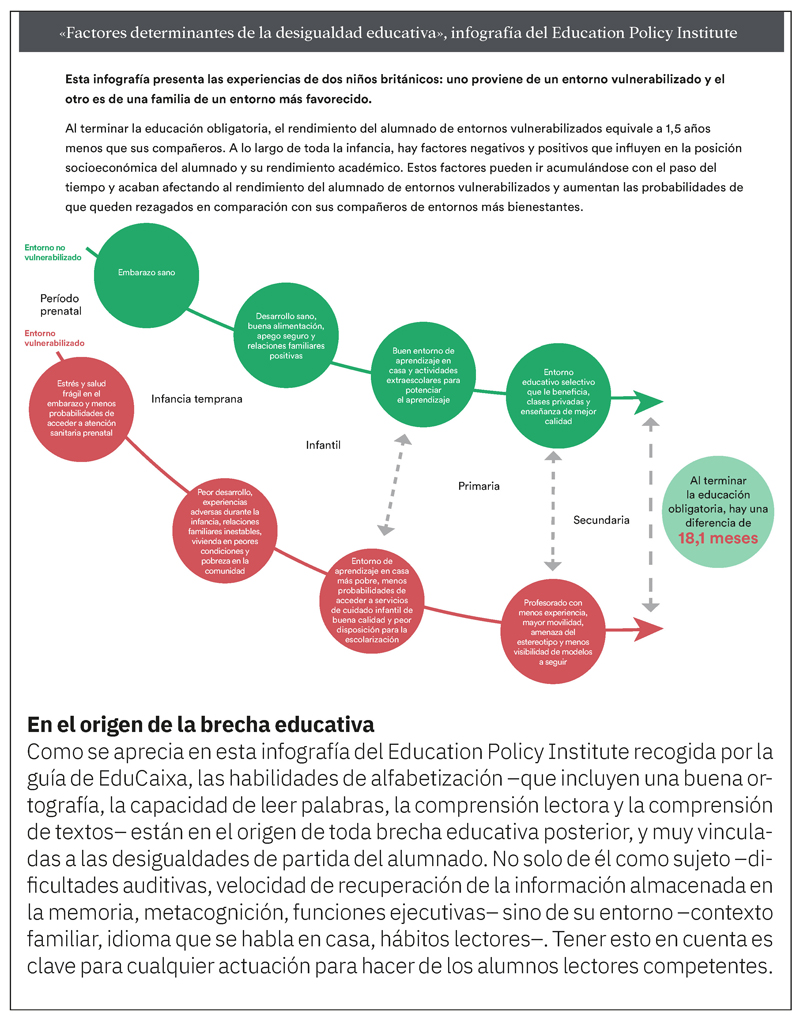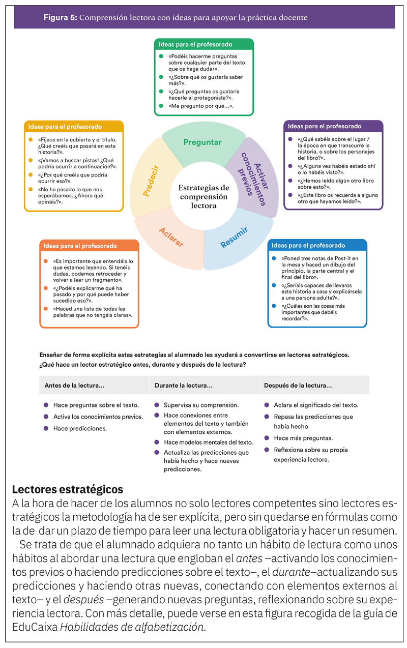 Todas las infografías incluidas en este artículo son solo una muestra de las gráficas que enriquecen y acompañan la lectura de la guía de EduCaixa Habilidades de alfabetización, que, como las anteriores en colaboración con la EEF, resume su propuesta en una serie de recomendaciones (en este caso, ocho), que permiten, de un vistazo, que el equipo docente aprecie dónde poner el énfasis para iniciar el proceso de cambio.