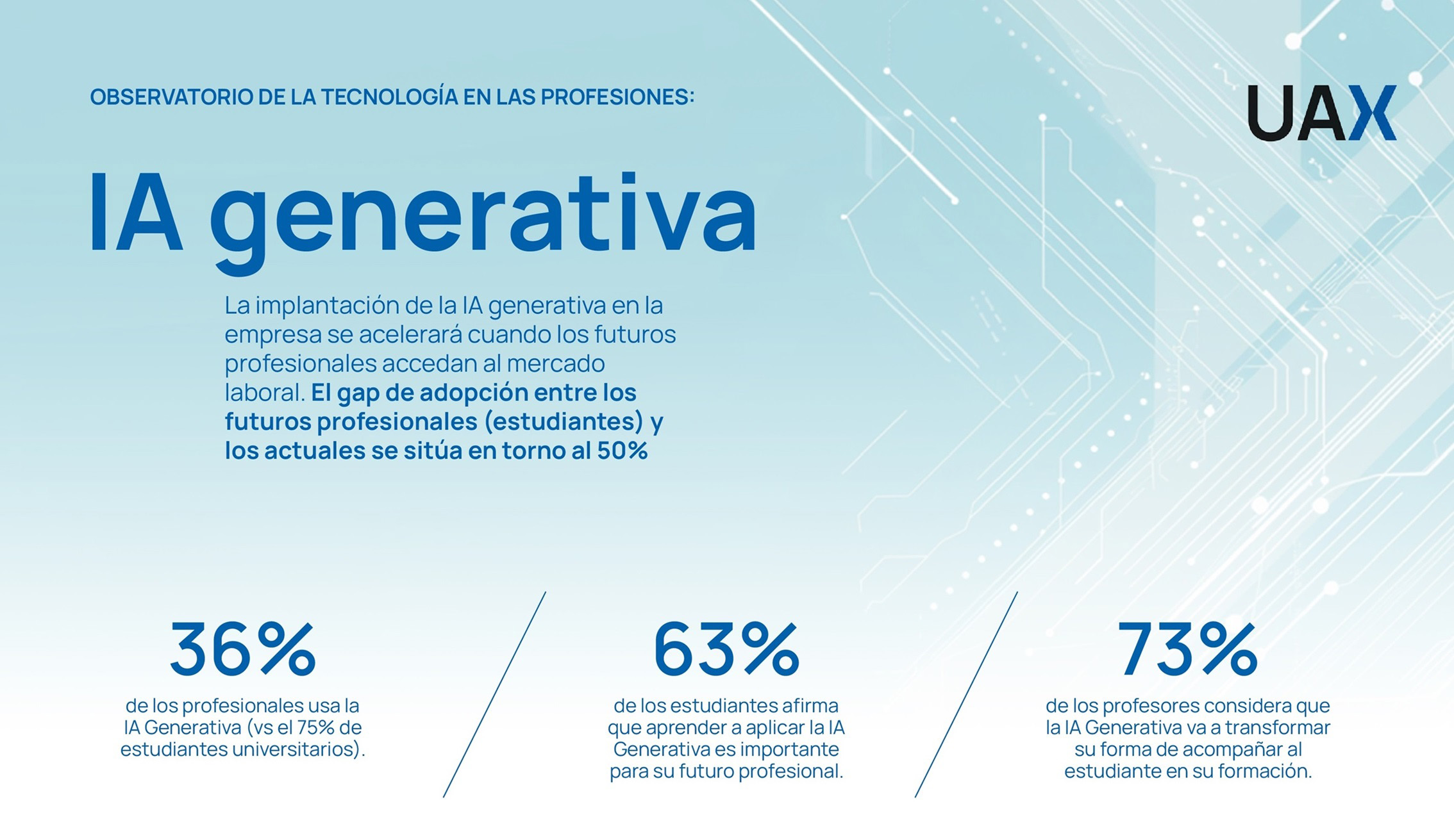 "Por su parte, el 63% de los estudiantes afirma que aprender a aplicar la IA Generativa es importante para su futuro profesional y más del 50% asegura que le ayuda en su aprendizaje. Estos datos muestran la adopción ascendente de la IA Generativa por las nuevas generaciones, y la necesidad urgente de integrar esta tecnología tanto en las metodologías y procesos del entorno empresarial como en el entorno educativo.