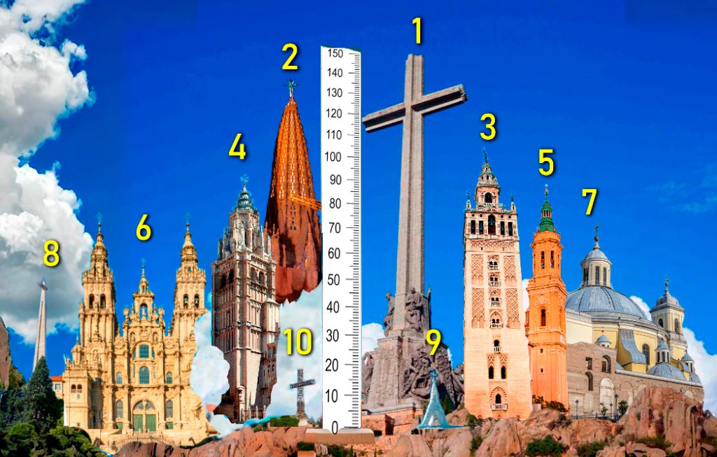 La Cruz del Valle de los Caídos (oficialmente renombrado como Valle de Cuelgamuros por la Ley de Memoria Democrática en 2020) supera también los 142 metros de las Torres Madrid y España (en la plaza del mismo nombre de la capital española) o los 144 de la Torre Agbar de Barcelona, y llega a la mitad de la altura de la Torre Eiffel. Con un peso de 200.000 toneladas, fue diseñada por Diego Méndez y preside la Abadía de la Santa Cruz de Valle de los Caídos, donde están enterrados cerca de 34.000 combatientes de ambos bandos de la Guerra Civil española y víctimas no combatientes, entre ellos 70 de las más de 2.000 personas a las que la Iglesia católica ha proclamado solemnemente como beatos mártires de la persecución religiosa del siglo XX en España.