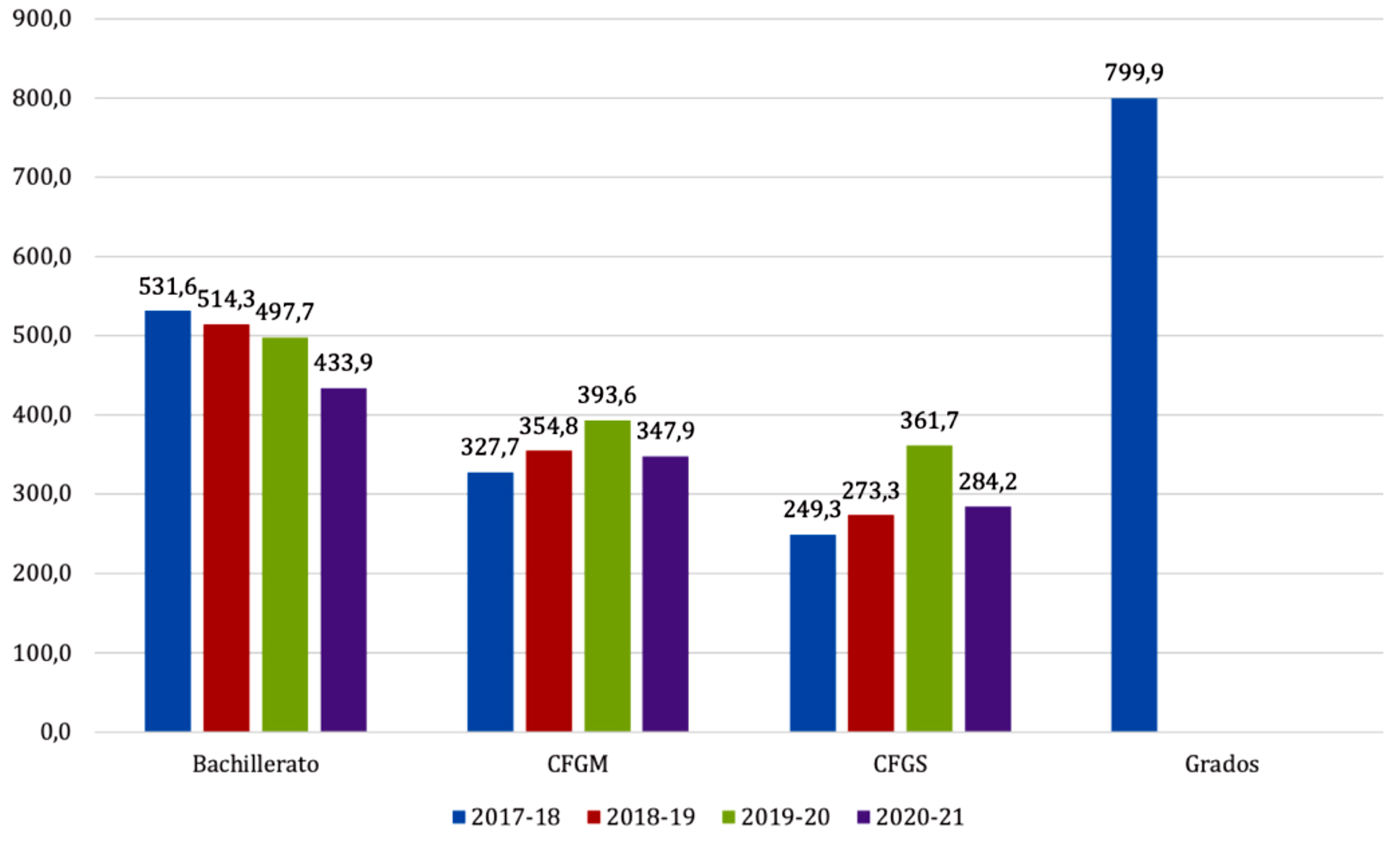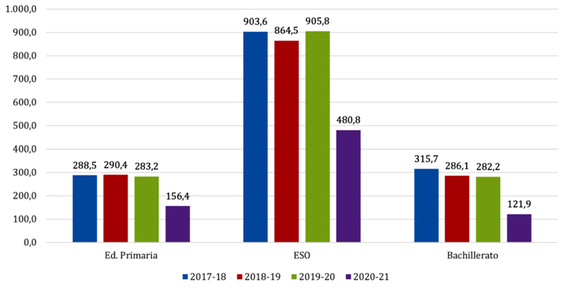Durante este periodo, se detecta una evolución decreciente en las tasas de repetición, especialmente durante la pandemia, pero un incremento sostenido en el coste por alumno, que ha pasado de los 5.110 euros en 2017 a los 5.629 euros en 2021.