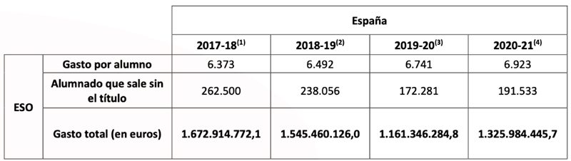 Por su parte, en lo referido al impacto económico generado por el alumnado que sale de la ESO sin el título, calculado en clave de desaprovechamiento de recursos, se ha elevado a los 5.705,7 millones de euros en los últimos 4 cursos en los que un total de 864.000 alumnos salieron de la ESO sin el título correspondiente.