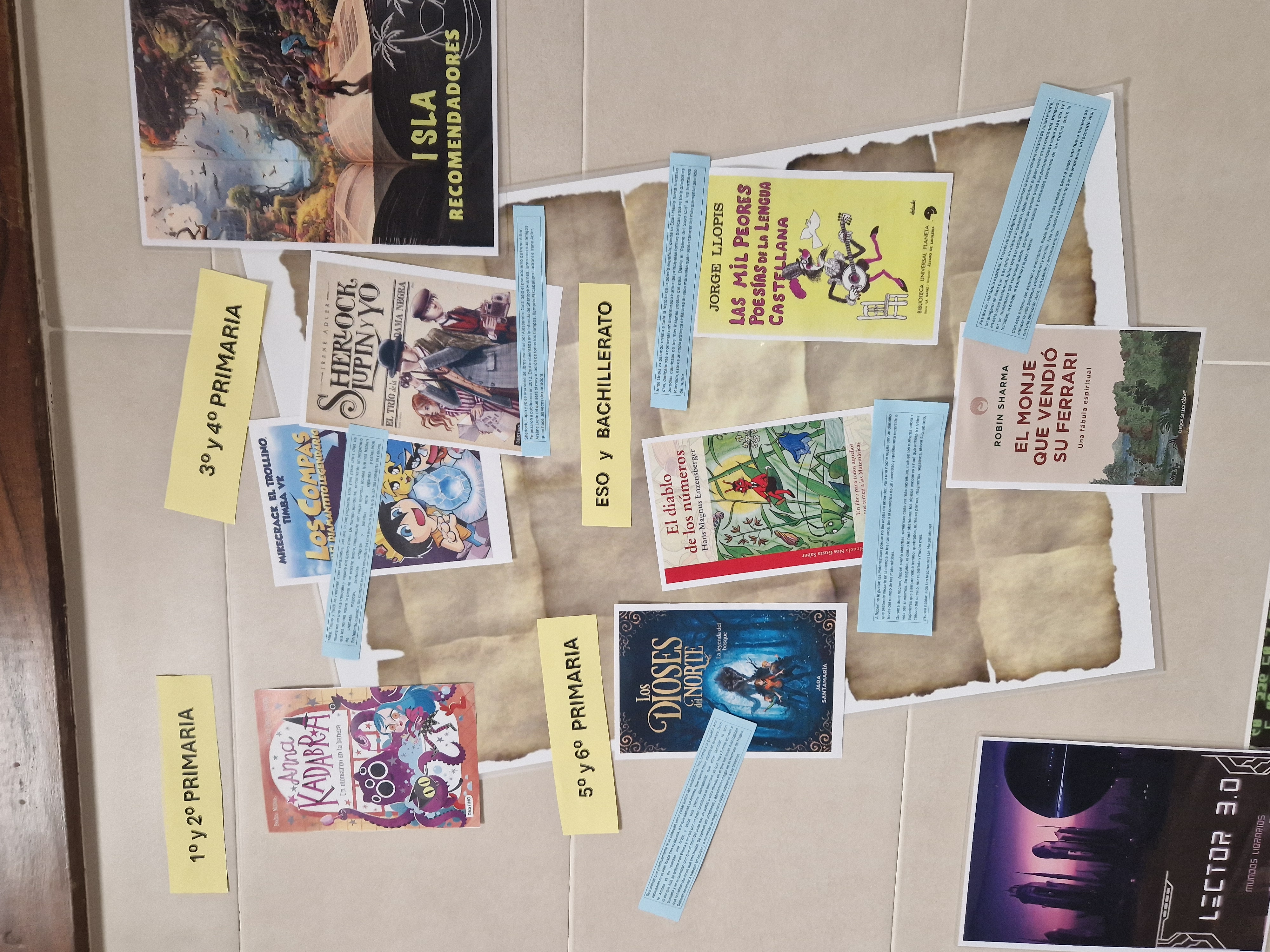 - Isla recomendadores: un espacio en el que se comparte la portada de los libros recomendados cada mes, con una pequeña reseña. Se diferencian por niveles educativos en primaria y por materias en secundaria.