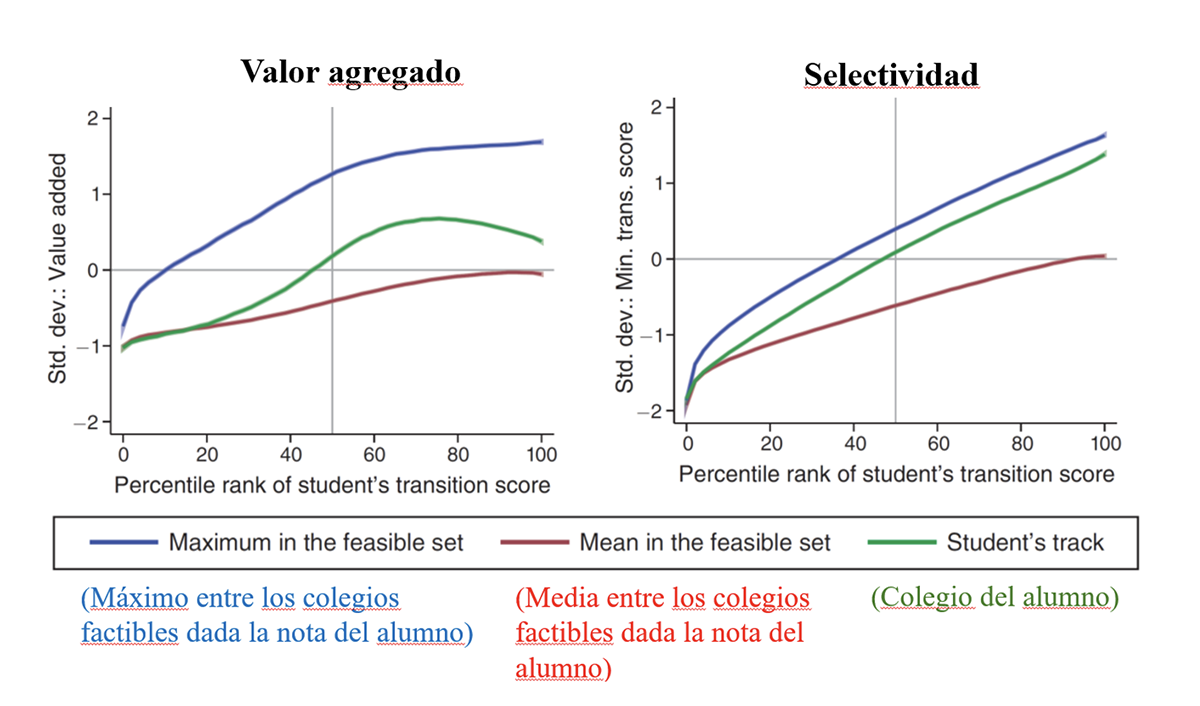 El Gráfico 1 en el estudio de Miguel Urquiola analiza la relación entre el valor agregado de los centros educativos y su selectividad, medida a través de la puntuación mínima de transición necesario. El Gráfico 1 muestra una relación positiva entre el valor agregado de las escuelas y su selectividad para los estudiantes con resultados bajos o medios. Sin embargo, curiosamente, esta relación se invierte y se vuelve negativa para los centros altamente selectivos. Este fenómeno podría sugerir que mientras más selectivo es un centro educativo, podría estar alcanzando un punto en el que la selectividad no necesariamente garantiza un mayor valor agregado, o incluso podría indicar que colegios más selectivos atraen a estudiantes con capacidades ya altas, lo que disminuye la percepción del valor agregado medido.