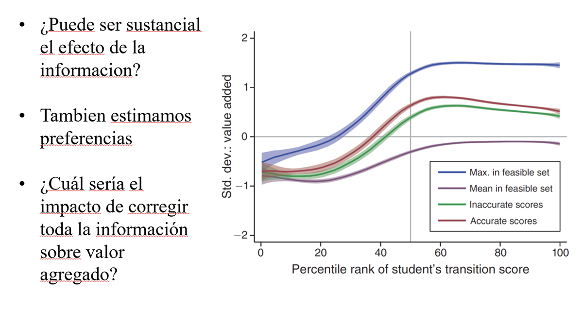 En este contexto, Miguel Urquiola de la Universidad de Columbia presentó un estudio (https://www.columbia.edu/~cp2124/papers/adpu_2022.pdf ) muy importante publicado en American Economic Review, la revista más prestigiosa en investigación en economía[1]. El artículo analiza las decisiones de los hogares respecto al valor agregado de los centros educativos, explorando por qué muchas familias no eligen las escuelas con el mayor valor agregado disponible. A través de datos administrativos en Rumanía, Urquiola reveló que las familias podrían optar por escuelas que ofrecen significativamente más valor agregado de lo que actualmente seleccionan. El análisis sugiere que esto puede deberse tanto a la falta de información adecuada como a las preferencias por otras características escolares, más allá del rendimiento académico per se. Posteriormente, a algunos hogares seleccionados al azar se les informó sobre el valor agregado de las escuelas, lo cual mejoró la precisión de sus creencias y los llevó a elegir escuelas con mayor valor agregado.