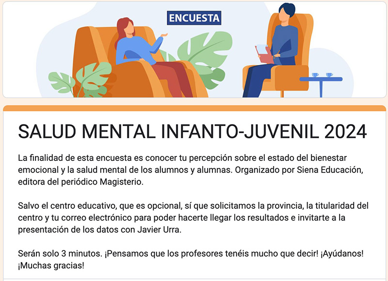 Responde la encuesta que Siena Educación acaba de lanzar. Serán solo 3 minutos para ti, y tu contribución servirá para conocer un poco más acerca de los problemas del salud mental del alumnado y mejorar en su abordaje.
