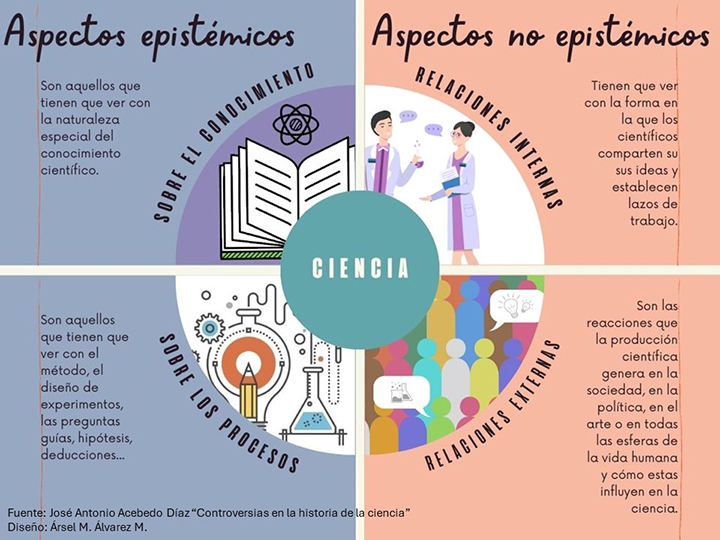- Entre los epistémicos, están aquellos aspectos relacionados con la naturaleza del conocimiento científico. Y es que el que se genera en ciencia no es como el conocimiento que surge en otras áreas como puede ser el arte, el psicoanálisis o la política… Huye de la subjetividad, pues parte del análisis objetivo de la realidad; produce teorías explicativas que, aunque abstractas, se demuestran capaces de orientar para descubrir nuevos fenómenos; y al mismo tiempo, son conocimientos que por su propia naturaleza deben poder ser demostrados falsos al contrastarse con la realidad.
