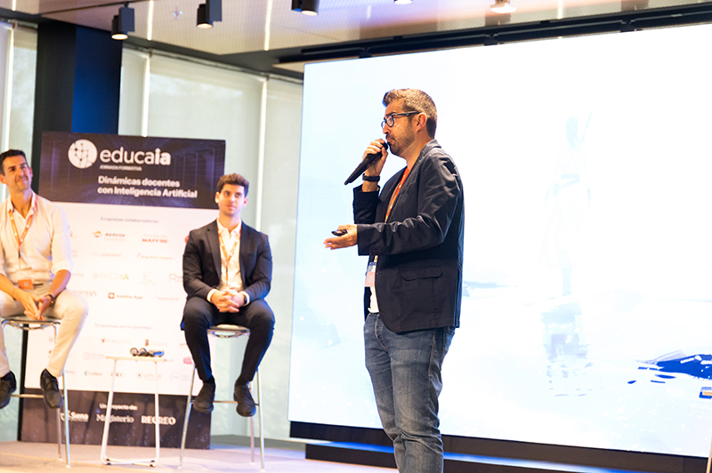 "Sobre la integración de la IA en el aula reflexionó Jorge Calvo, del Colegio Europeo de Madrid, que planteó que la IA es una herramienta fantástica pero no podemos usarla «cuándo y dónde queramos». Para Calvo, el profesor no debe perder su papel como «piloto» del aula que deciden cómo y dónde integrar la IA y debe sopesar siempre si la IA puede acabar suplantando las capacidades de los alumnos o hacerle demasiado dependiente de ella. Desde Digital Robots Alejandro Máñez explicó cómo la IA puede ayudar no solo con trámites burocráticos, como el proceso de matriculación, sino en la mejora misma de la experiencia del estudiante. Por su parte, César Poyatos, profesor de Tecnología Educativa en el Departamento de Pedagogía de la Universidad Autónoma de Madrid, insistió en la necesidad de verificar lo que la IA nos devuelve, y declaró: «Sin conocimiento no puedes crear, ni con IA ni sin IA». Por todo ello, Poyatos se declaró partidario de la formación al alumnado en un buen uso de la IA, «para que no jueguen en desigualdad».