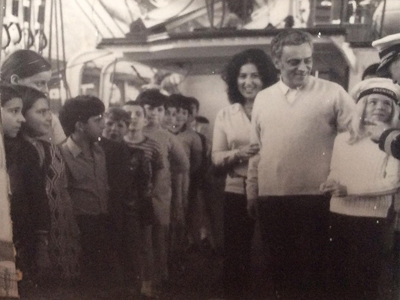 ‘El Mae’ y la ‘Seño Nieves’ con su alumnado, en los años 60, en la fragata Danmmark, un buque escuela danés con el que la Escuela Montessori estaba muy vinculado y cuyas visitas se producían cada vez que atracaba en el puerto capitalino.