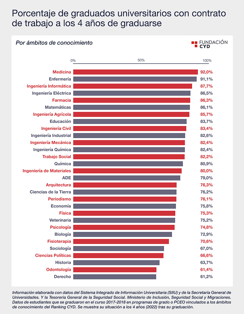 Por encima del 80% se sitúan Matemáticas (86,1%), Ingeniería Agrícola (85,7%), Educación (83,7%), Ingeniería Civil (83,4%), Ingeniería Industrial (82,6%), Ingeniería Mecánica (82,4%), Ingeniería Química (82,4%), Trabajo Social (82,2%), Química (80,9%) e Ingeniería de Materiales (80%). Por debajo del 70% se sitúan los graduados de los ámbitos de Sociología (67%), Ciencias Políticas (66,6%), Historia (63,7%), Odontología (61,4%) y Derecho (61,2%).
