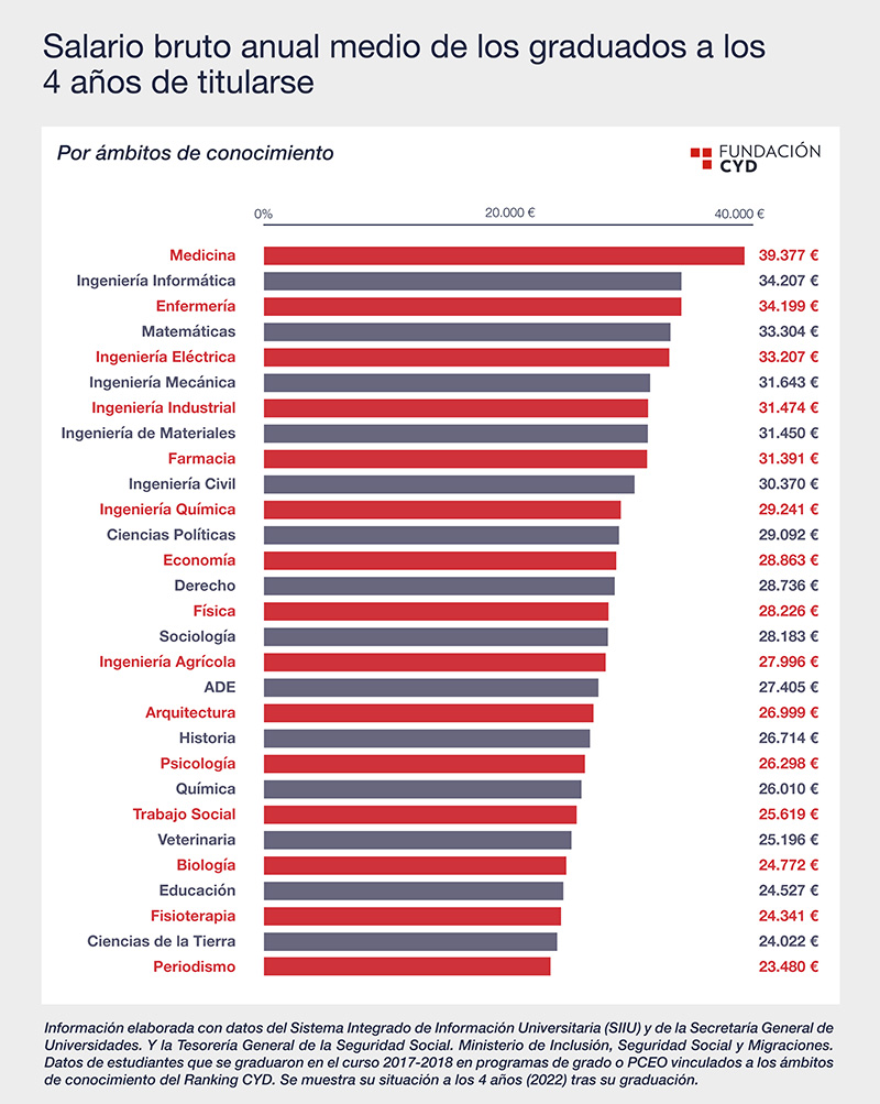 Cuando han transcurrido 4 años de la obtención del título, los titulados en los ámbitos de Medicina (39.377 €), Ingeniería Informática (34.207 €), Enfermería (34.199 €), Matemáticas (33.304 €) e Ingeniería Eléctrica (33.207 €), son los que perciben el mayor promedio de salario anual bruto. Por encima de los 30 mil euros se sitúan los titulados en Ingeniería Mecánica (31.643 €), Ingeniería Industrial (31.474 €), Ingeniería de Materiales (31.450 €), Farmacia (31.391 €) e Ingeniería Civil (30.370 €). En el extremo inferior, los graduados que perciben un salario medio inferior a los 25 mil euros son Biología (24.772 €), Educación (24.527 €), Fisioterapia (24.341 €), Ciencias de la Tierra (24.022 €) y Periodismo (23.480 €). Teniendo en cuenta los datos disponibles, la media salarial de los graduados españoles a los 4 años de titularse es de 27. 878 €.