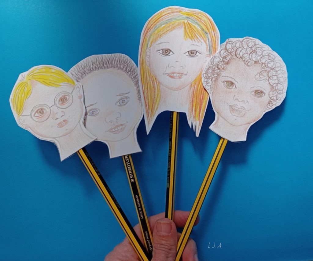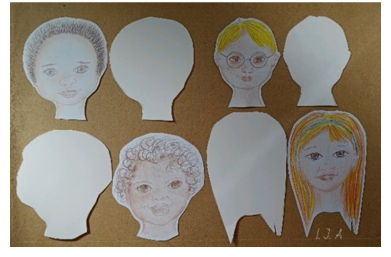Una vez hayan conocido a sus nuevos amigos, el siguiente paso es hacer que participen en la realización de las marionetas. Para ello crearemos una plantilla donde aparezcan las caras que puedan colorear. Según estemos trabajando con niños y niñas en Infantil o Primaria, necesitarán más o menos ayuda por nuestra parte. Pero básicamente seguirán tres pasos: