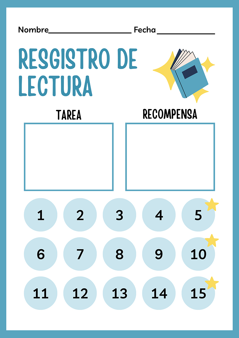 Llegados al final, puedes descargar aquí debajo la plantilla para hace el registro de lectura. En Tarea se debe escribir lo que hayamos propuesto leer, pueden ser un número de páginas, capítulos o libros para el tiempo que queramos establecer, así como las recompensas propuestas para fomentar la lectura positivamente.