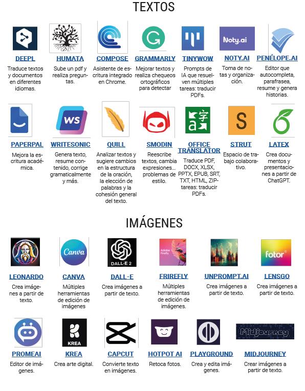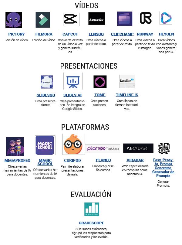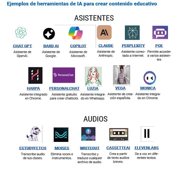 También ofrece interesantes ejemplos de prompts, de generación de materiales para asignaturas, de generación de rúbricas y de desarrollo de habilidades por medio de la IA, además de una selección de herramientas útiles en educación: