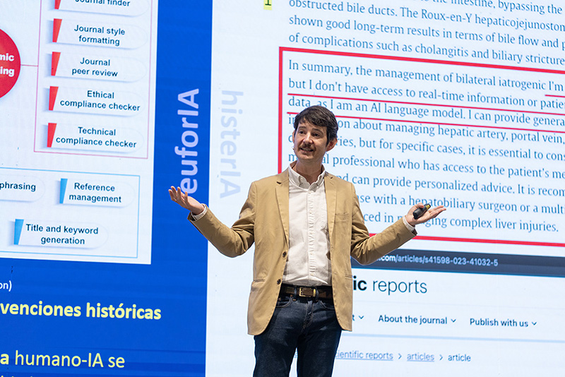 “No humanicemos la tecnología, las máquinas no alucinan, cometen errores; no piensan, pero nos imitan; no tienen opiniones, las reflejan…”, señaló a la vez que recomendaba herramientas como Ai Teaching Assistant Pro (asistente personal de enseñanza y diseño), Poe.com (chatbot personalizado), Gamma.app (creación de presentaciones), Chattube.io (chatear con videos de YouTube), Turbolearn.ai (generador de notas, resúmenes y cuestionarios personalizados), Elicit (analizar trabajos de investigación), Consensus (motor de búsqueda de IA para investigación) y ResearchRabbit (plataforma de investigación).