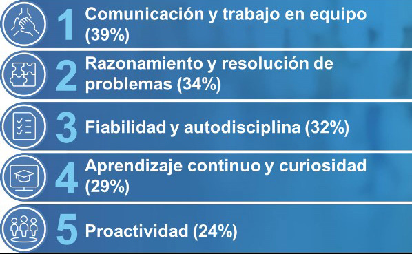 Aunque son las más complejas de medir, en los últimos años se ha disparado la importancia de las soft skills o habilidades sociales por su papel en la creación de un ambiente de trabajo positivo. Según el estudio Desajuste de talento 2024 de ManpowerGroup, las cinco más demandadas por las empresas españolas son la comunicación y el trabajo en equipo; el razonamiento y resolución de problemas; la fiabilidad y autodisciplina; el aprendizaje continuo y la curiosidad; y la proactividad.