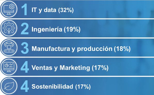 Por su parte, las hard skills o competencias técnicas, siguen siendo relevantes, aunque existen diferencias en función del sector. Las que más demandan las empresas españolas son las relacionadas con la tecnología y la gestión del dato. Seguidas a cierta distancia de las ingenierías; las relacionadas con la manufactura y la producción; las ventas y el marketing; y las vinculadas a la sostenibilidad, dado el emergente papel de la transición verde.