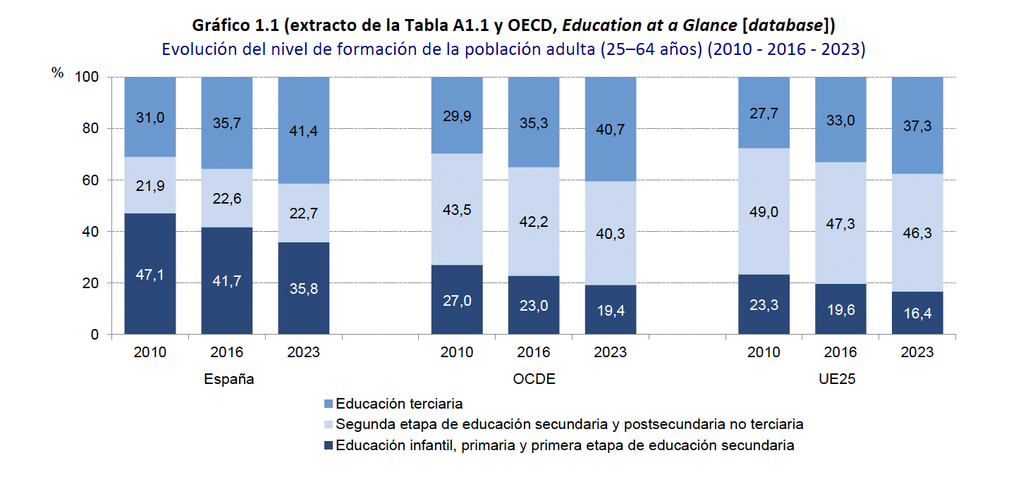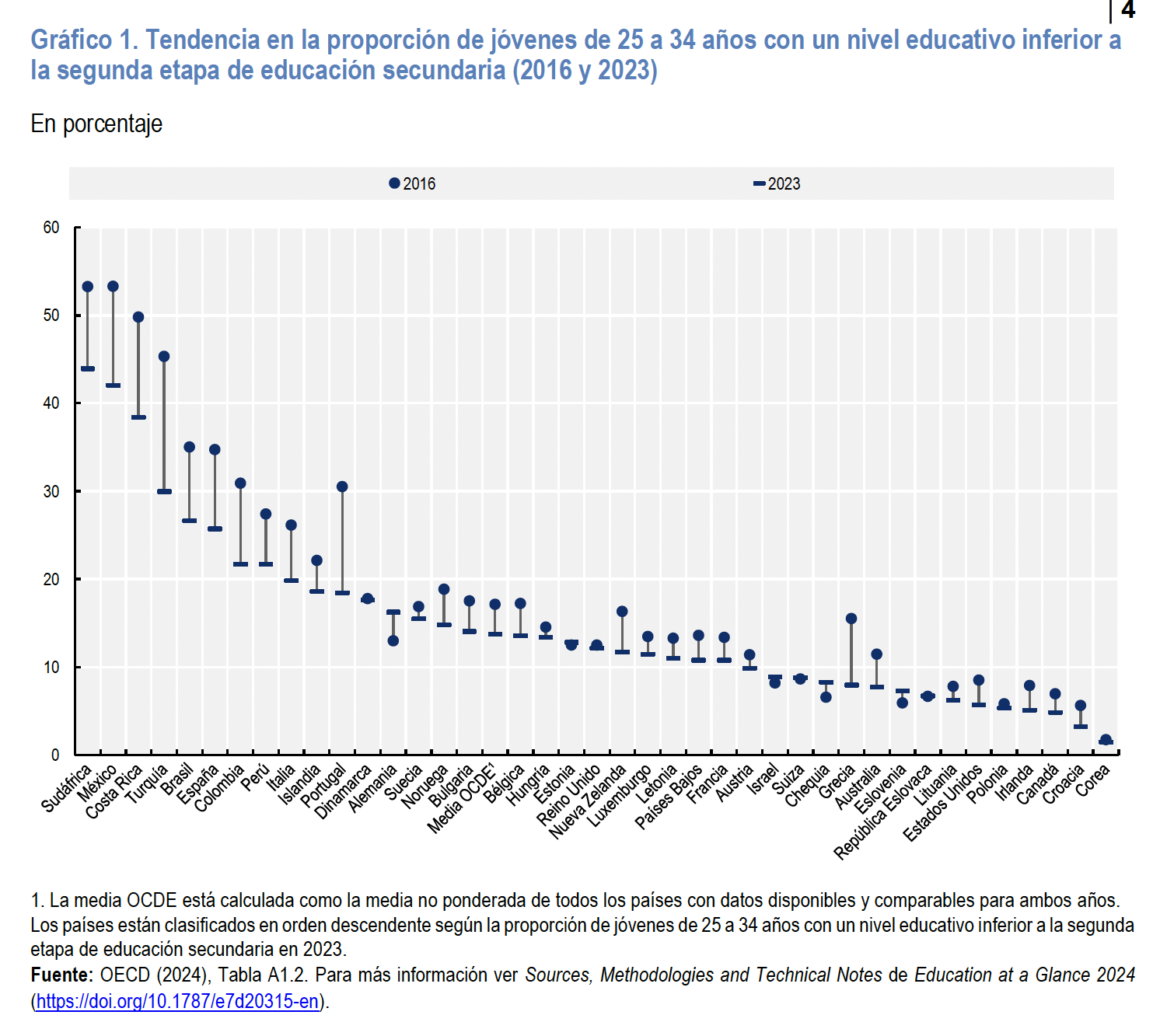 Education at a Glance presenta cada año una visión general acerca de los sistemas educativos de la OCDE. En el caso de España, el informe 2024 (con datos de 2023) vuelve a mostrar tasas muy elevadas de jóvenes entre 25 y 34 años sin Secundaria postobligatoria (26% frente al 14% de media de la OCDE). Una explicación para ello es la baja tasa de alumnos que optan en España por la FP de Grado Medio. En cambio, en el lado positivo, la Educación terciraria se ha convertido en el nivel educativo más común entre los jóvenes de esas edades, con el 52% en 2023 (once puntos más que en 2016).