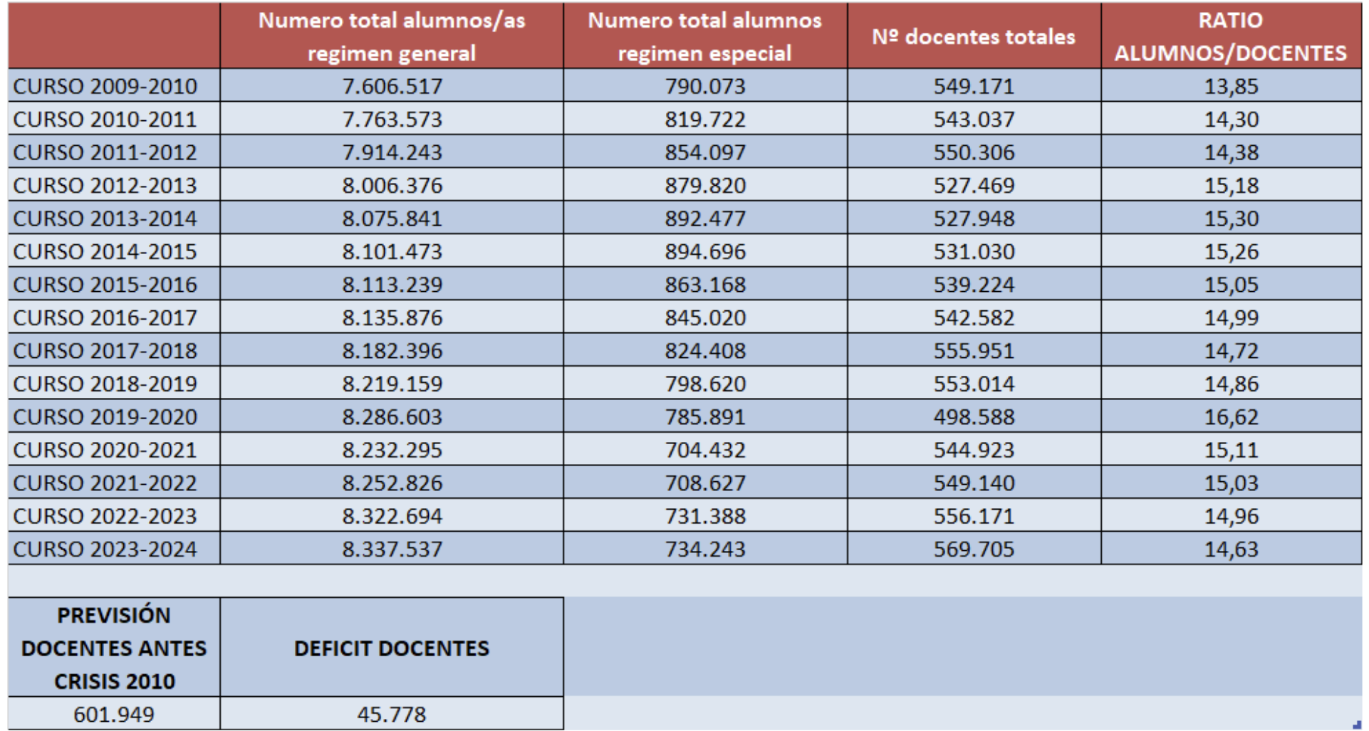 El sindicato ha presentado en rueda de prensa su Informe de inicio de curso y ha alertado de que la escuela pública abre las aulas con los mismos problemas estructurales de los últimos años, agravados por la falta de financiación en educación y por las diferencias de criterio entre Gobierno y comunidades autónomas. En su estudio destaca la inestabilidad de las plantillas y la falta de profesores. Según sus datos, si se compara el ratio alumno/docente de 2010 –año de los recortes educativos, que aún no se han recuperado, denuncia– con las cifras actuales, hay un déficit de 45.778 profesores. En el curso 2009-10 había un ratio de 13,87 alumnos por cada docente y ahora la cifra ha subido a 14,63, lo que se traduce en falta de desdobles, especialistas y equipos de orientación completos, resalta.