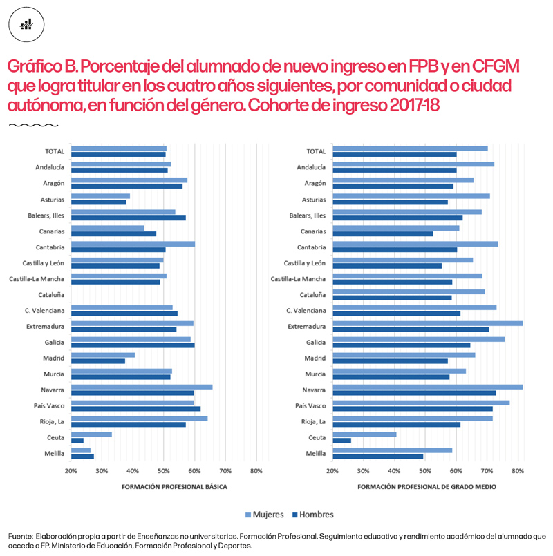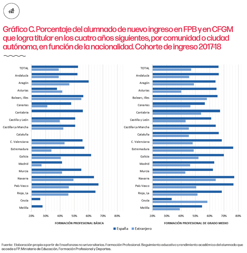 Junto con las diferencias entre regiones, es importante destacar la dispersión en las tasas de titulación en función de factores como el género o la condición de inmigrante. Respecto al género, el gráfico B refleja que, en regiones como Cantabria o en la Ciudad de Ceuta, las tasas de titulación en FPB son notablemente más altas para las mujeres. En el caso de los CFGM esta ventaja a favor de las mujeres se evidencia en todas las regiones, con diferencias especialmente marcadas en Ceuta (14,8%), Principado de Asturias (13,5%), Cantabria (13,3%) y Andalucía (12,2%).