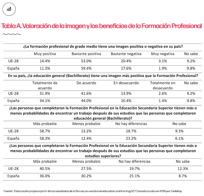 De hecho, los datos recogidos en la European public opinion survey on vocational education and training llevada a cabo por el European Centre for the Development of Vocational Training en 2016 (tabla A) reflejan cómo, mientras que la Formación Profesional tiene una imagen bastante positiva y se percibe que tiene la capacidad de proporcionar a los jóvenes la cualificación necesaria para poder acceder al mercado laboral, si se compara con los itinerarios académicos (Bachillerato), su imagen es menos favorable y sigue considerándose como una ‘segunda opción’.
