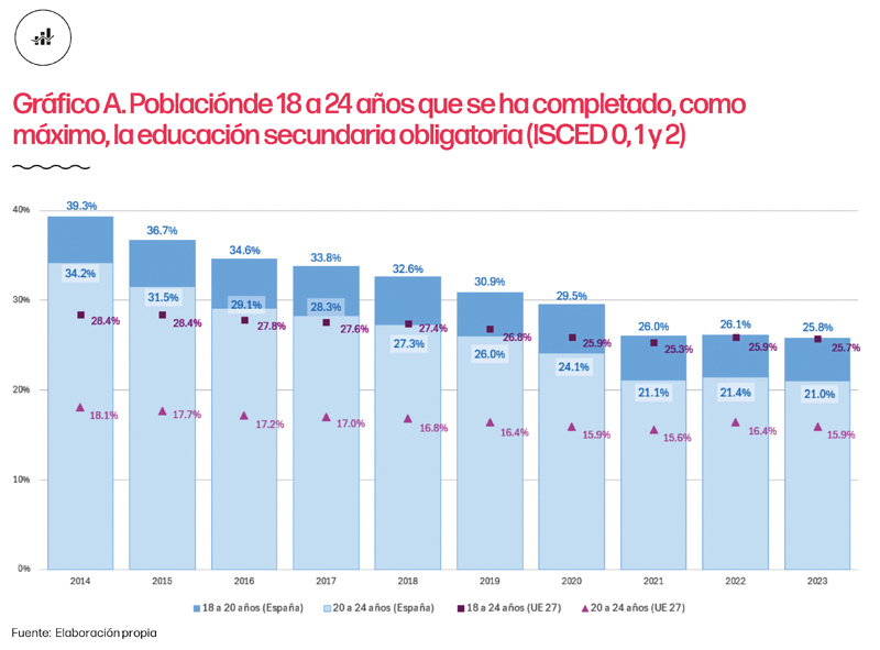 Junto con lo anterior, si adoptamos una perspectiva más restrictiva y analizamos el porcentaje de la población de entre 18 y 24 años que no ha logrado obtener una titulación de Educación Secundaria Posobligatoria (gráfico A), observamos que, en el año 2023, más del 25% de los jóvenes españoles de estas edades no había alcanzado dicho nivel educativo, siendo este porcentaje comparable al registrado para el conjunto de la UE-27. Sin embargo, en España, el porcentaje continúa siendo superior al 20% para los jóvenes de entre 20 y 24 años, lo cual representa una diferencia de aproximadamente cinco puntos porcentuales respecto al registro europeo para esa franja de edad. Estos valores también revelan una realidad preocupante: uno de cada cuatro jóvenes de entre 18 y 24 años –así como uno de cada cinco jóvenes de entre 20 y 24 años– no ha completado el segundo ciclo de Educación Secundaria y, este insuficiente nivel de cualificación podría limitar sus oportunidades de empleo tanto presentes como futuras.