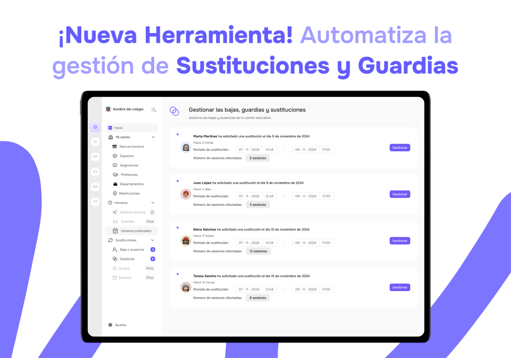 Con el gestor de sustituciones de Nuela, los centros educativos pueden gestionar de manera rápida y eficiente todas las bajas, guardias y sustituciones, automatizando completamente el proceso o las partes que el centro decida, desde la solicitud de la baja hasta la notificación al sustituto, de forma centralizada en un único canal.