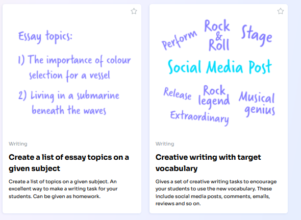 Dentro de Twee hay muchas herramientas, y una de ellas es writing. En este apartado tenemos cinco recursos que nos permiten crear distintos tipos de actividades. Con la combinación de dos o tres de ellas, ya podrías llenar una sesión de un par de horas o toda una unidad didáctica.